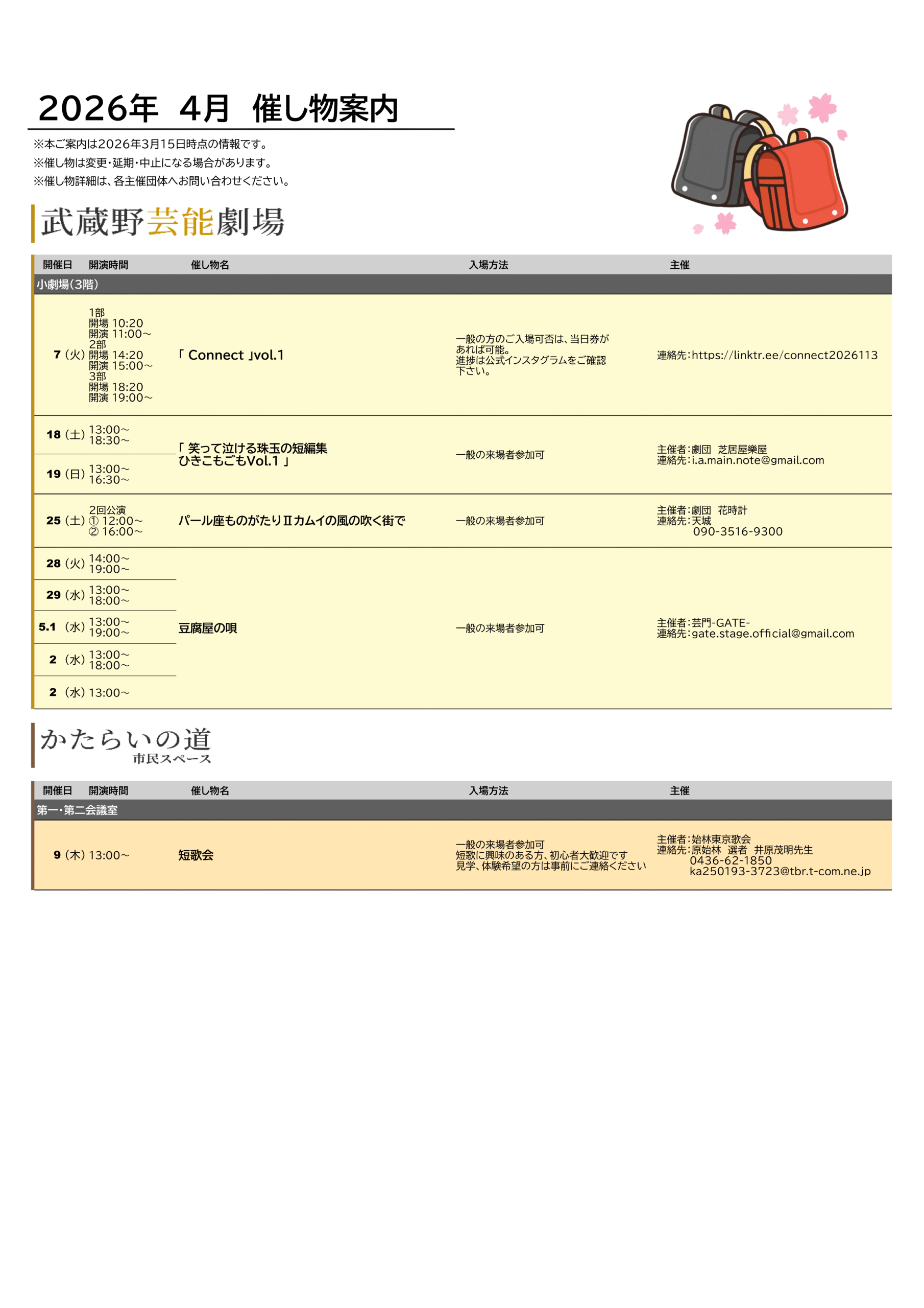 4月も武蔵野芸能劇場・かたらいの道市民スペースでは、多彩な催し物を予定しております。