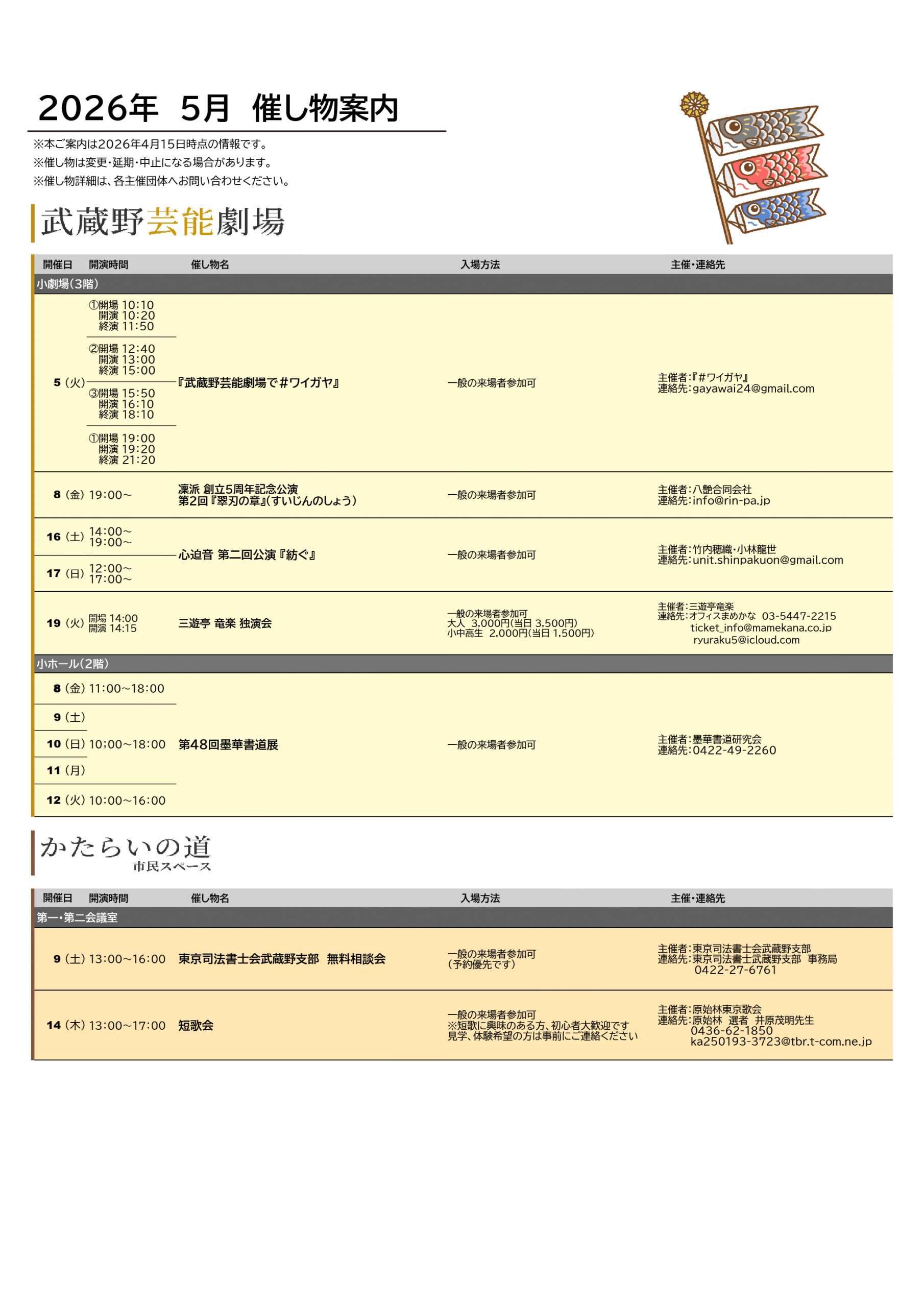 5月も武蔵野芸能劇場・かたらいの道市民スペースでは、多彩な催し物を予定しております。